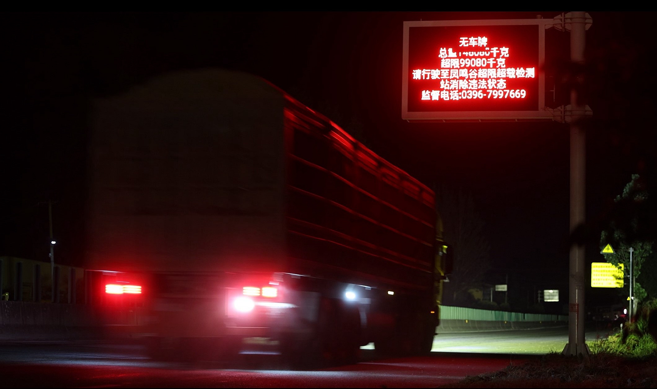 超载车进入漯河市325省道非现场超限检测点,电子眼监控设备灯光虽启用、电子屏也处于运转状态,但超载车通过地磅后,电子屏未显示车辆载重等信息。