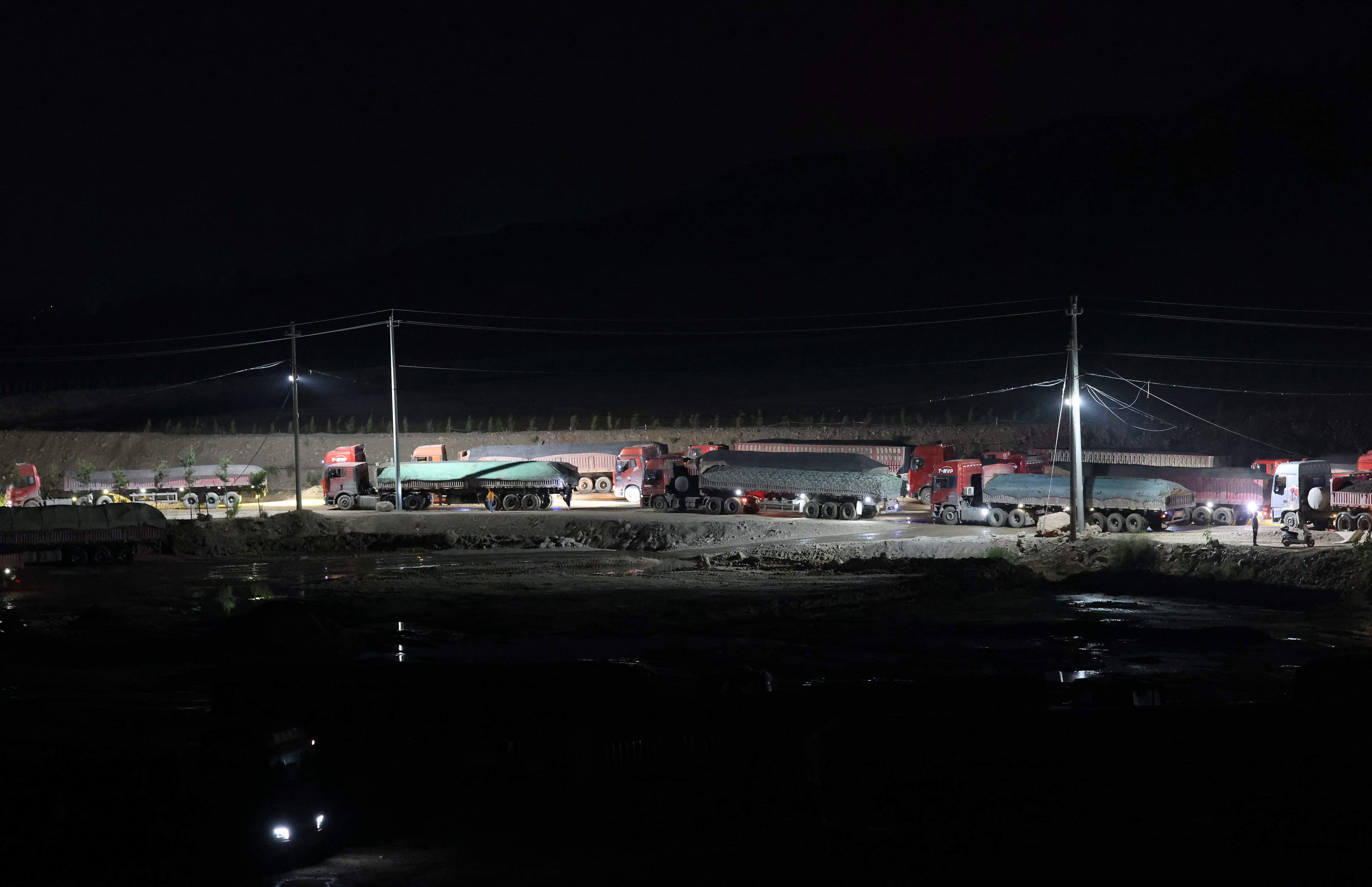 5月24日22时,永顺铝土公司自备路路边停放着几十辆遮挡号牌的超载车。 新京报记者 李英强 摄