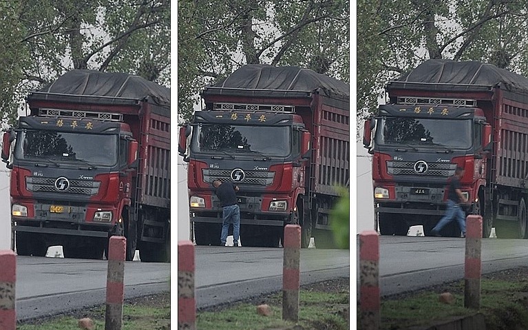 新京报记者注意到由南向北通行的超载货车,一般在距离张洪庄西桥检测点约1公里的马庄村界牌停车,司机下车后用专用号牌布遮挡前后牌照,而后驾驶车辆通过检测点地磅,电子屏只显示车辆超限吨数,无法显示车牌信息。车辆驶出检测点后,司机停车取下牌照遮挡布。