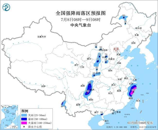 r预计,7月8日08时至9日08时,浙江中南部和东部、福建东北部、四川东部、重庆西部、贵州西北部、内蒙古东北部、陕西大部、山西中部、云南西北部等地部分地区有大到暴雨,其中,浙江东南部、福建东北部、四川东部等地部分地区有大暴雨(100~230毫米)。上述部分地区伴有短时强降水(最大小时降雨量20~50毫米,局地可超过70毫米),局地有雷暴大风等强对流天气。
